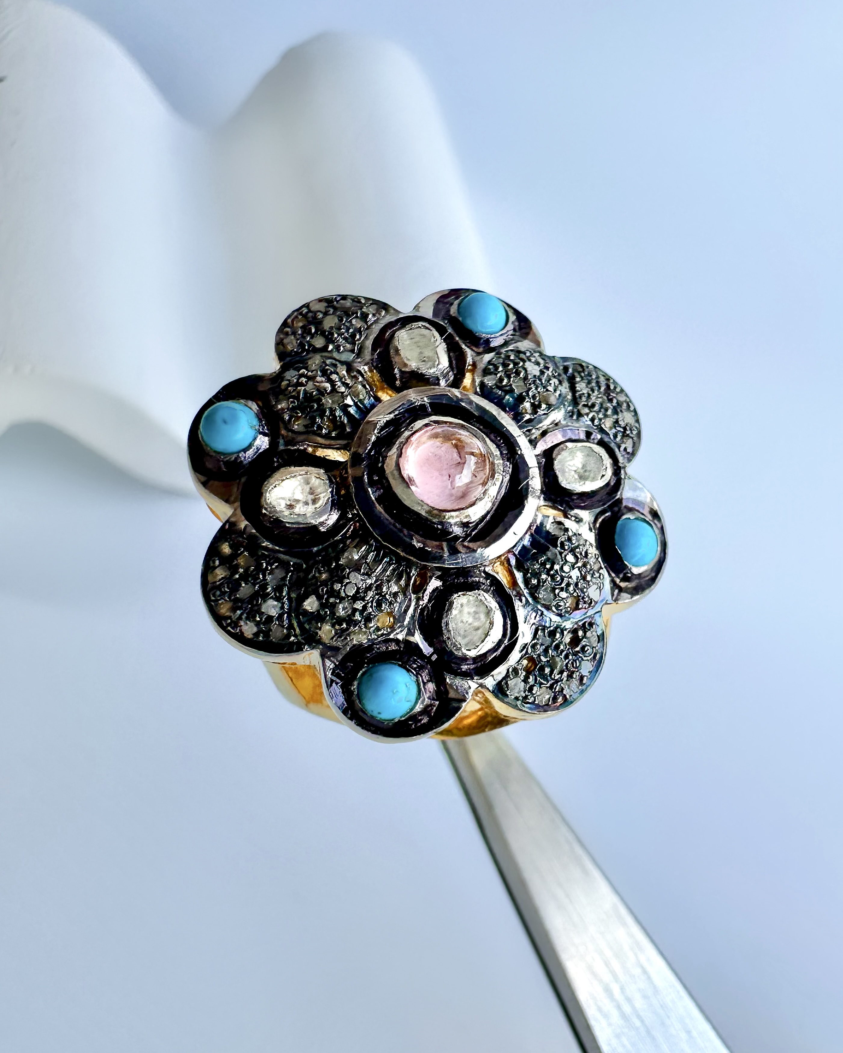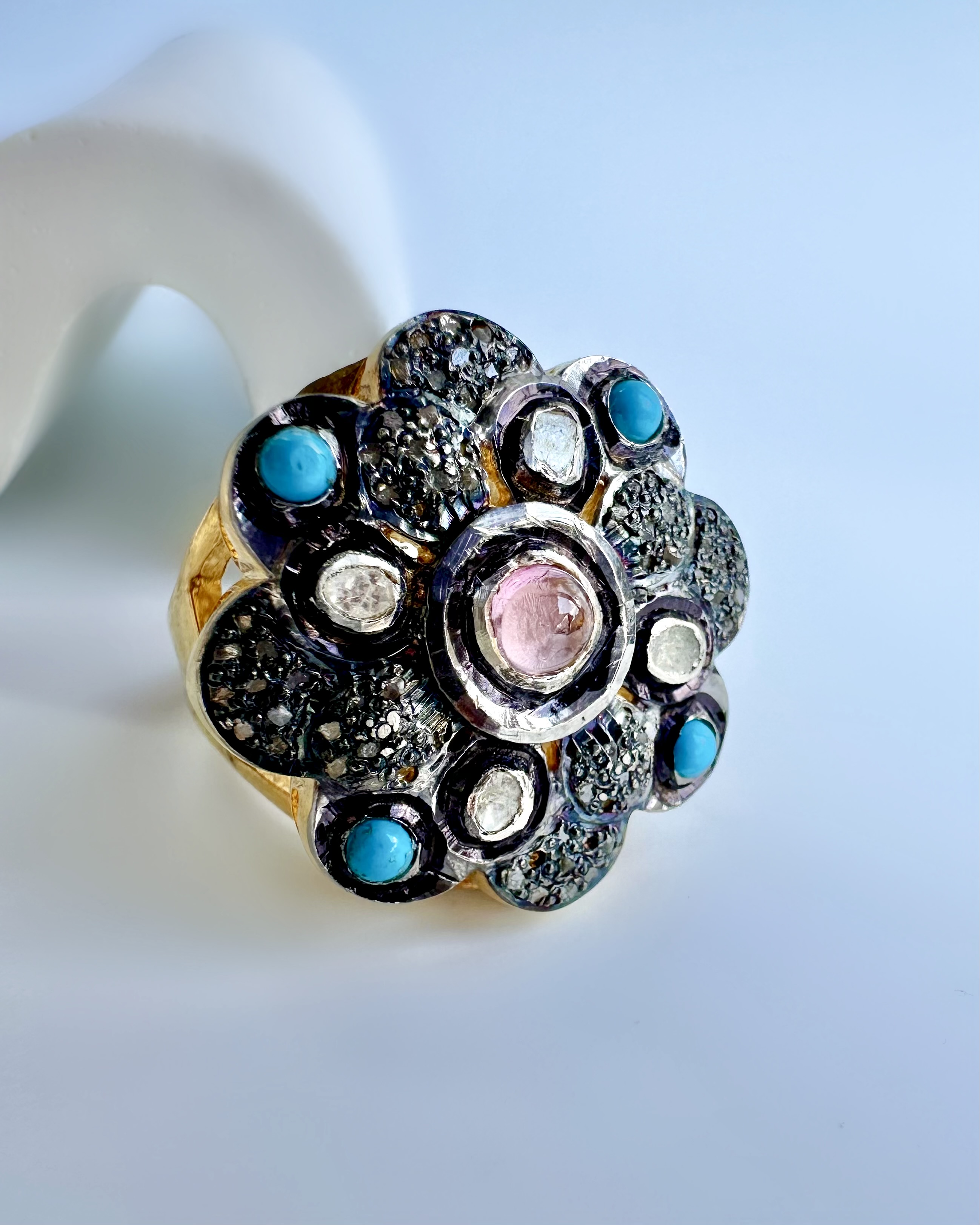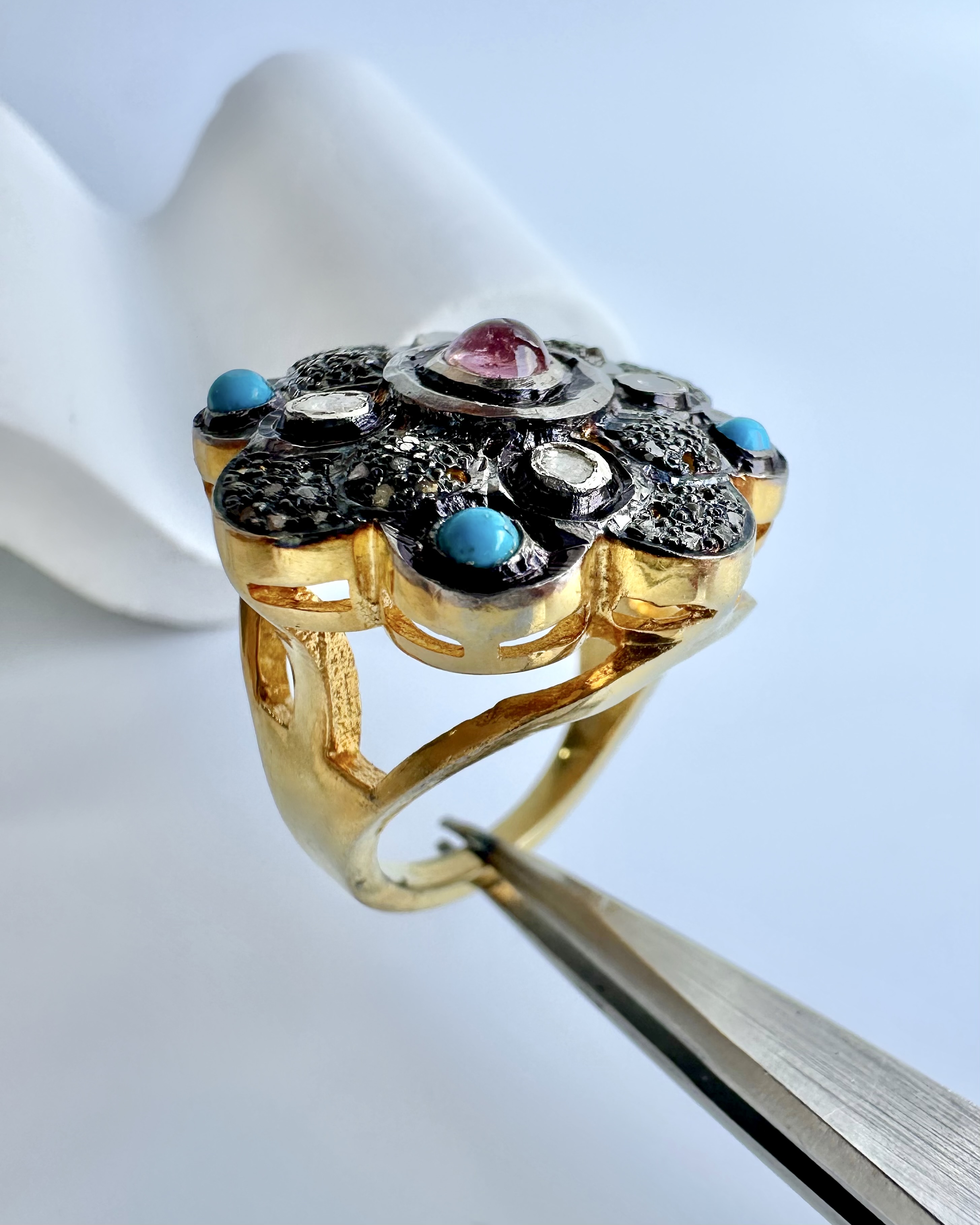Tamamen El İşçiliği 925 Ayar Gümüş Üzeri Altın Kaplama Naturel Elmas, Turkuaz ve Turmalin Taş Tasarım Yüzük