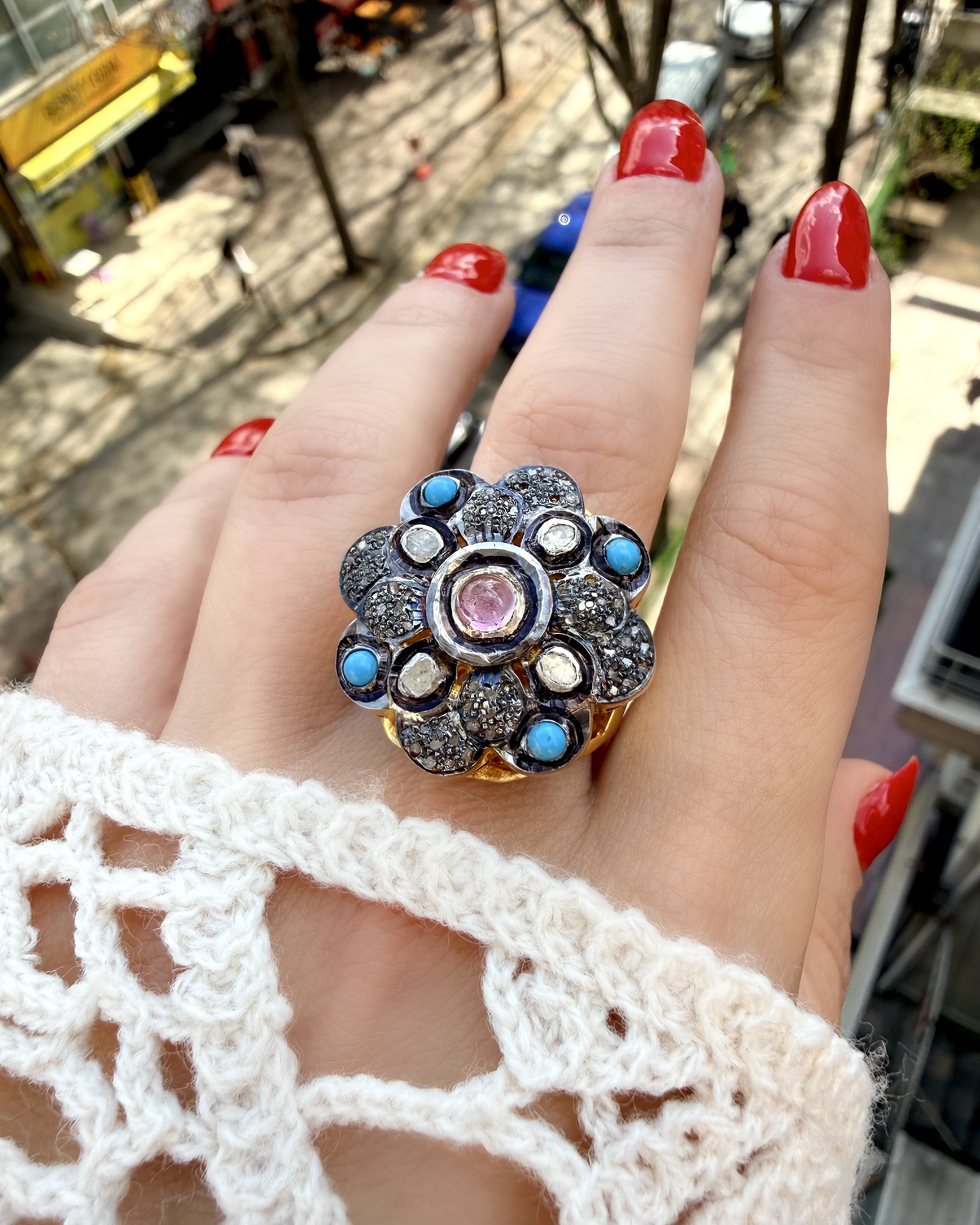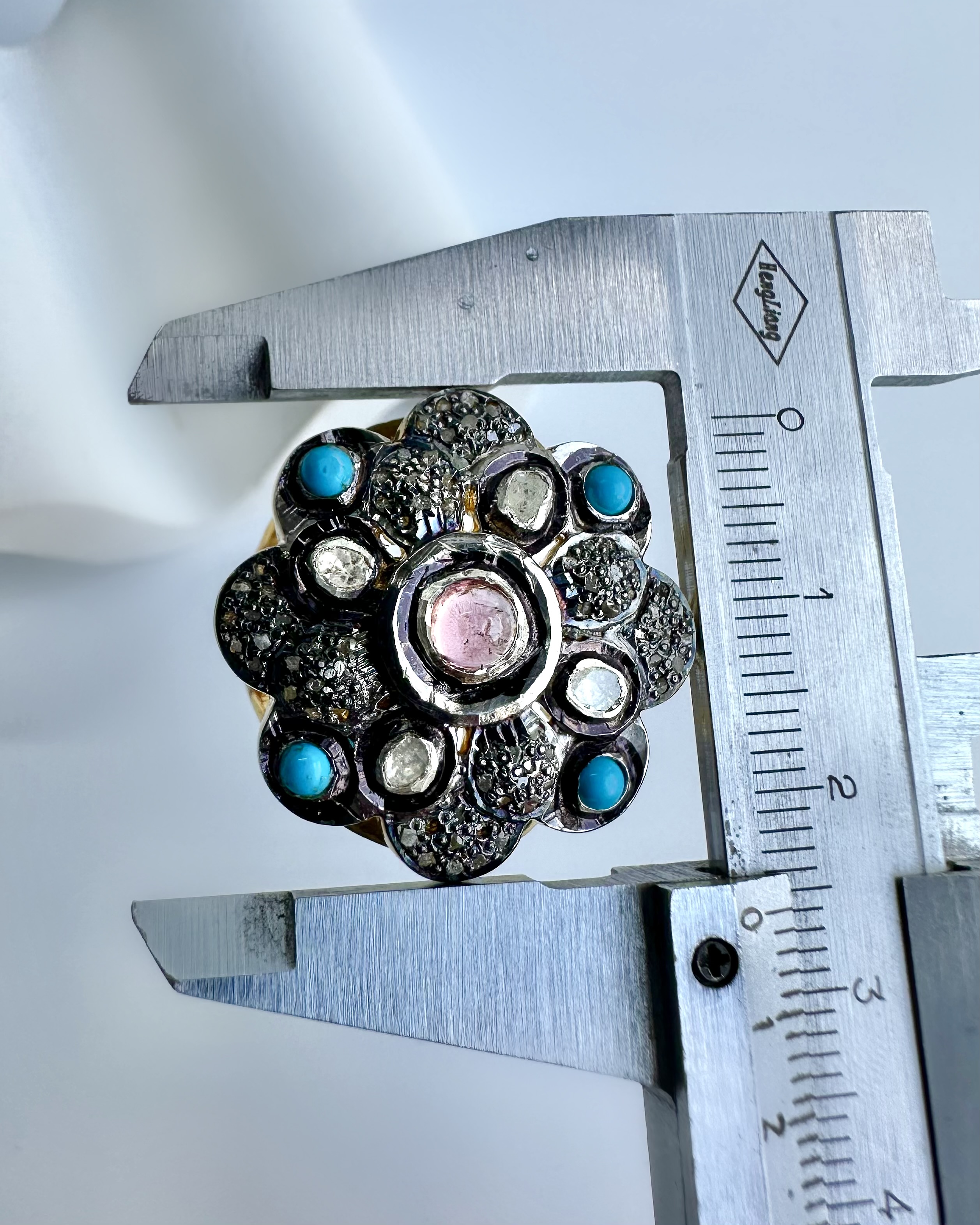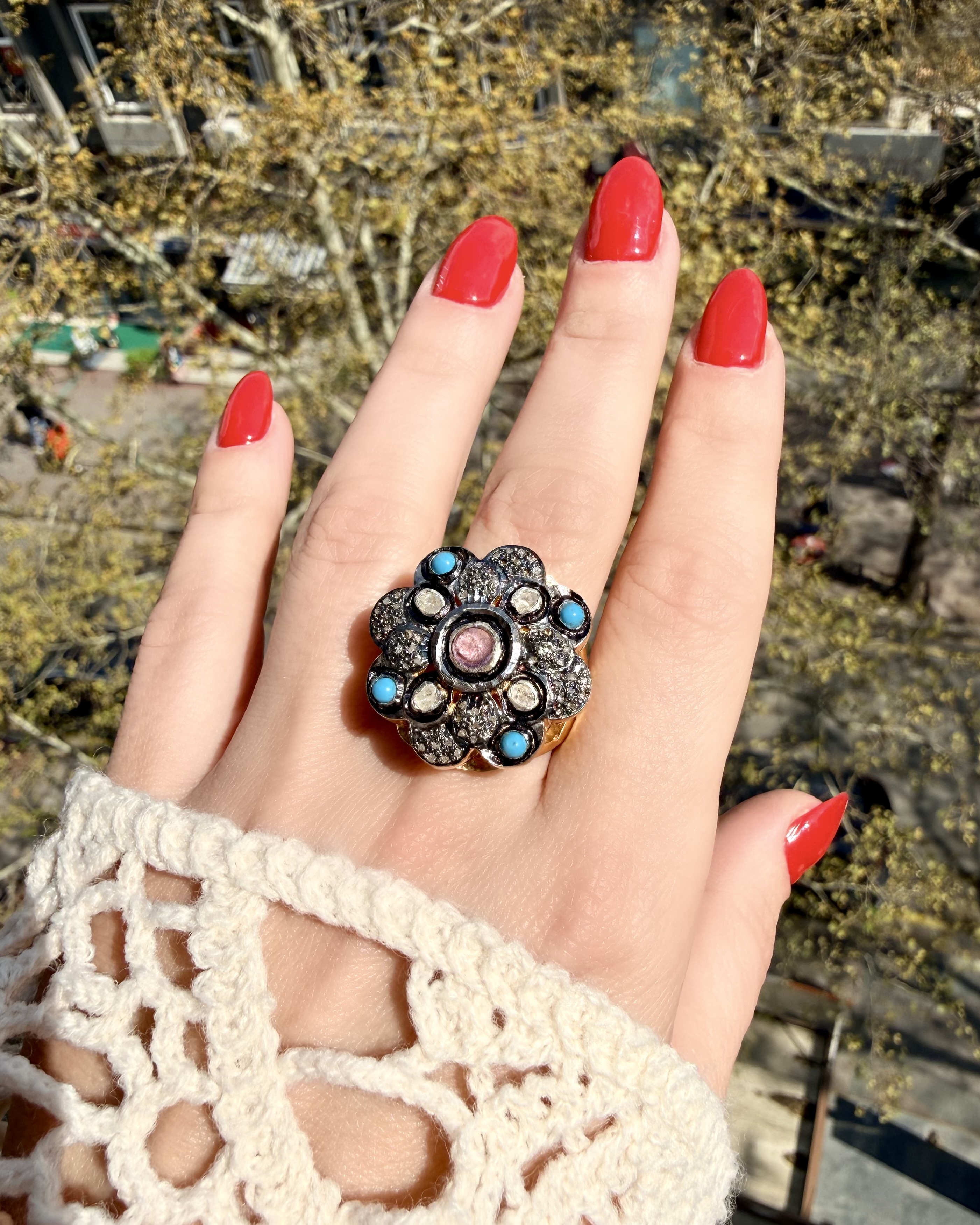 Tamamen El İşçiliği 925 Ayar Gümüş Üzeri Altın Kaplama Naturel Elmas, Turkuaz ve Turmalin Taş Tasarım Yüzük