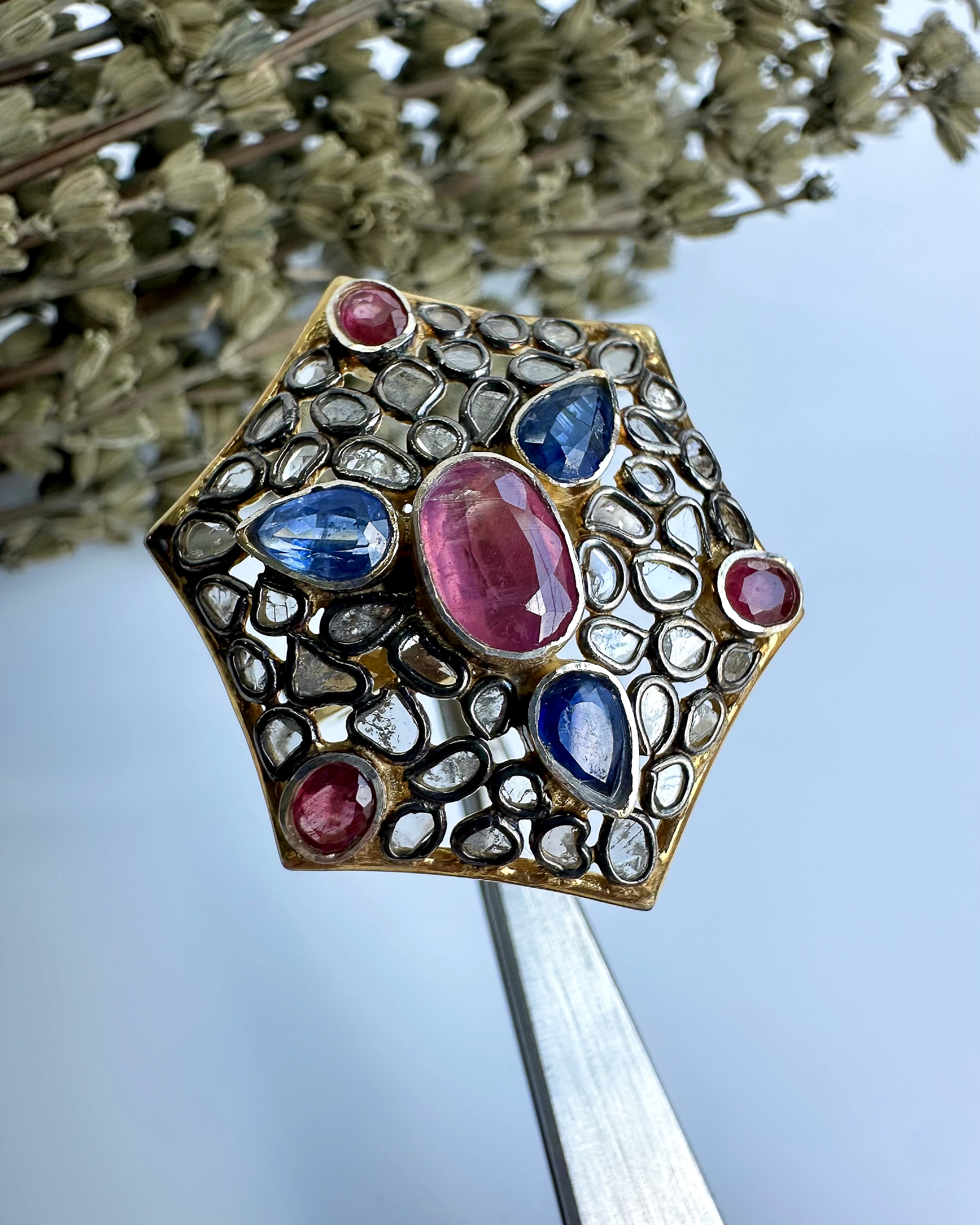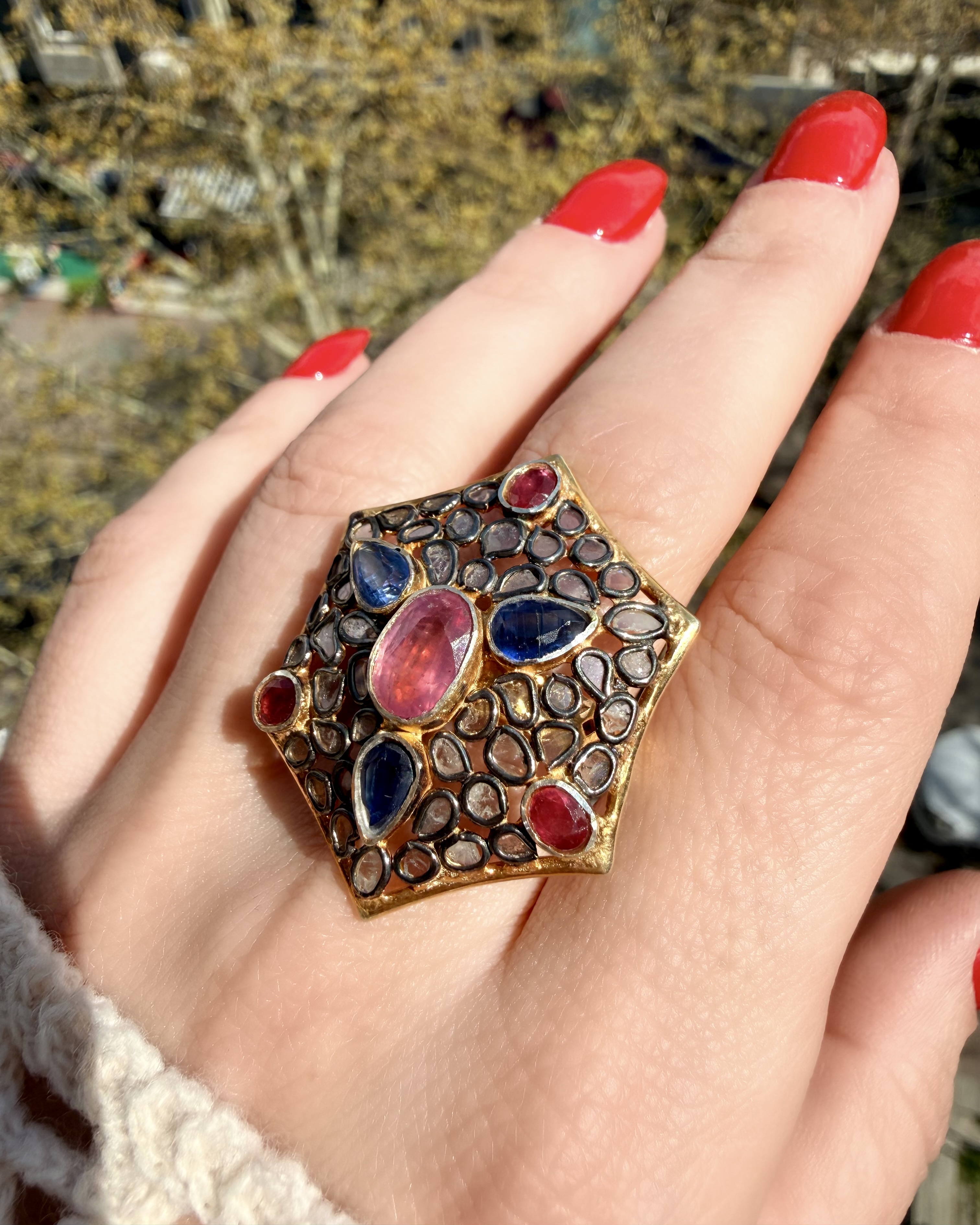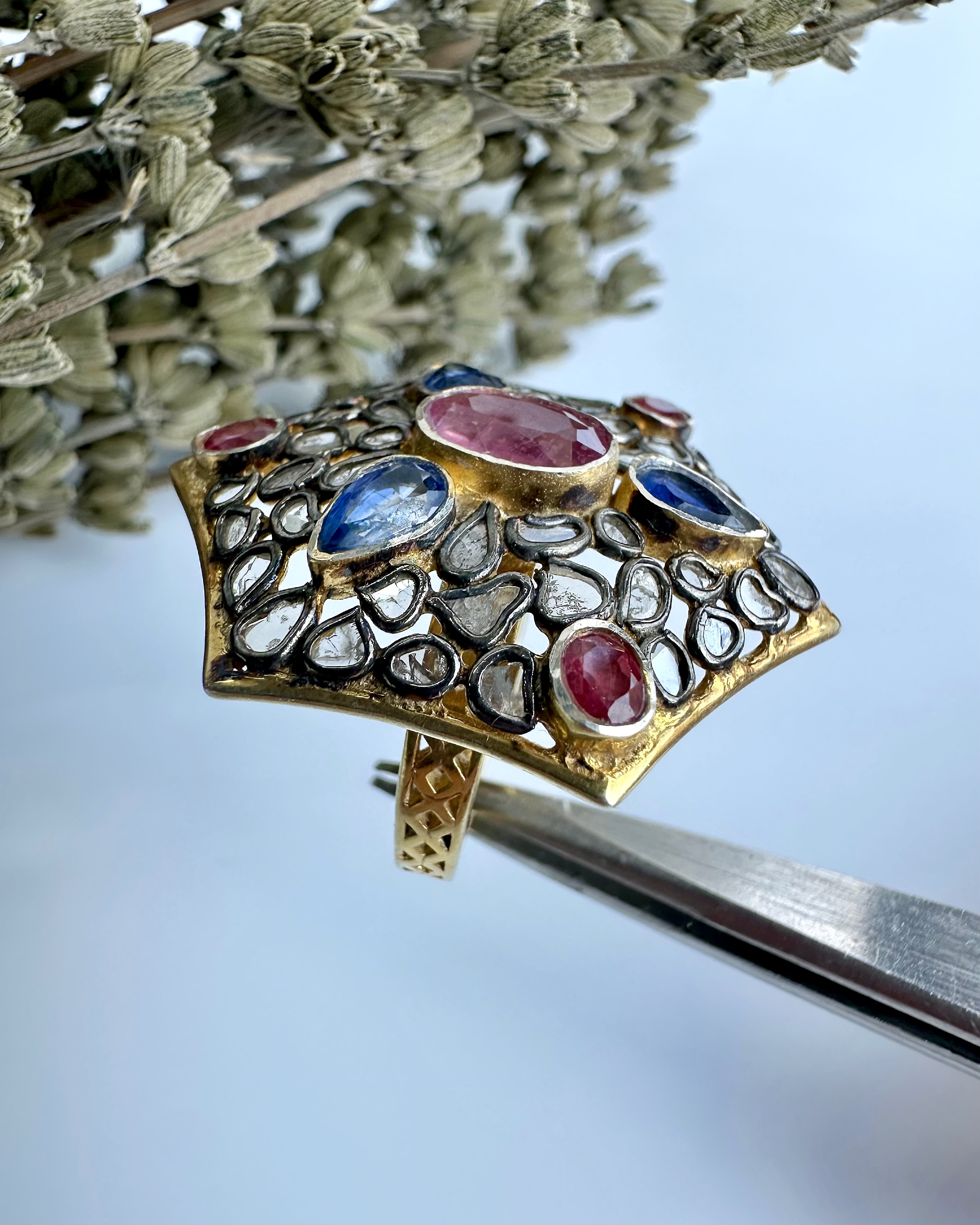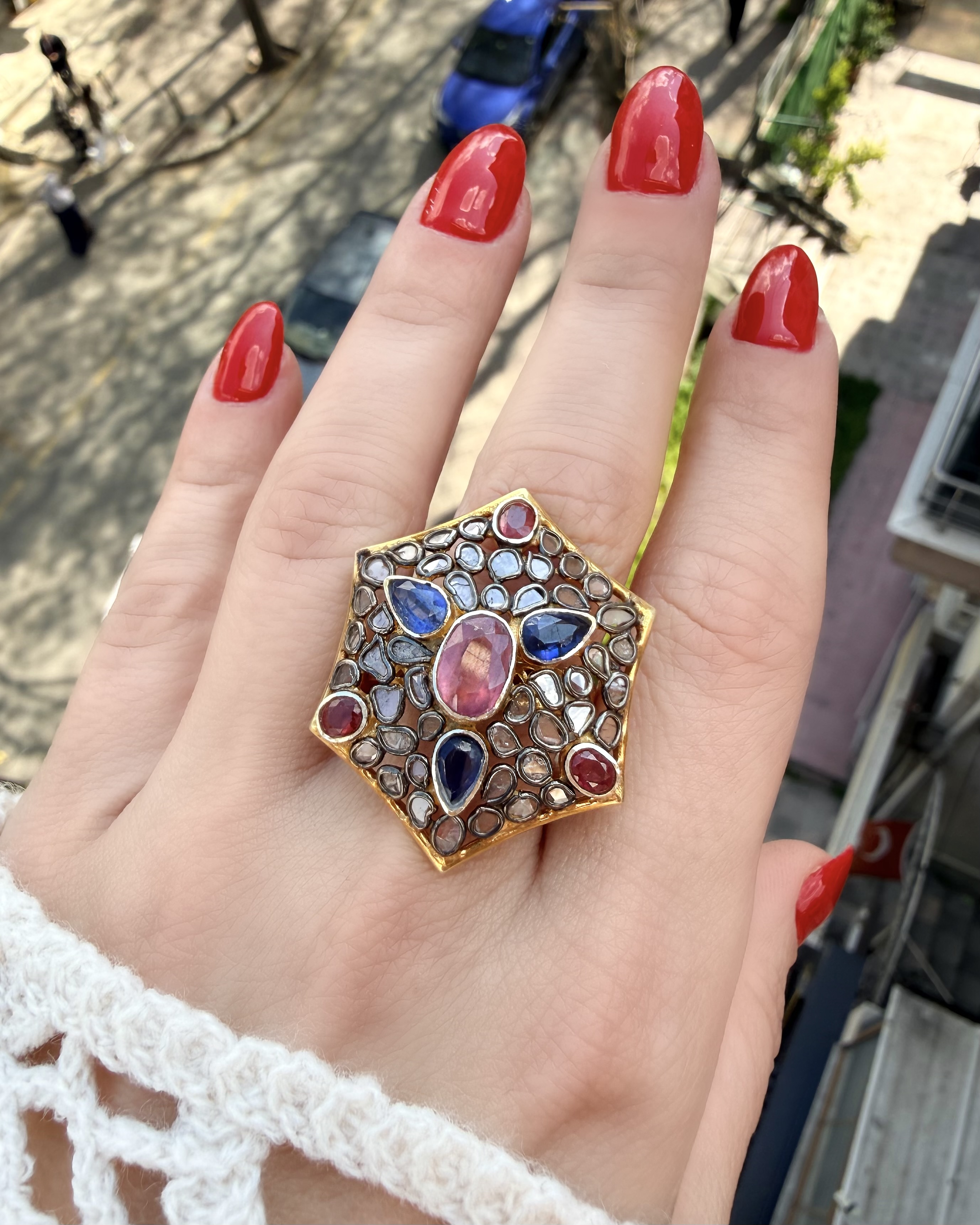 Tamamen El İşçiliği 925 Ayar Gümüş Üzeri Altın Kaplama Naturel Elmas, Yakut ve Safir Taş Tasarım Yüzük